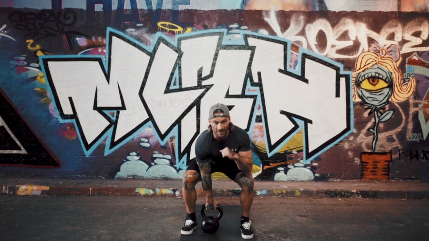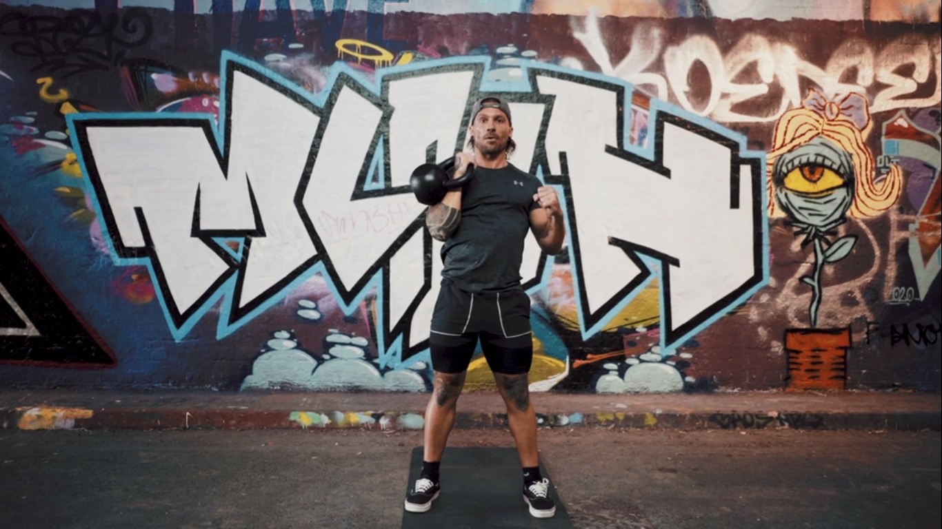 This exercise assumes you already know how to do the double arm press, so make sure you watch that video first if you don't. For the start position, approach the bell, chop and drop the hips and put one hand on the bell. Pack the shoulders - roll the shoulder blades back and down. The other arm should be forward.